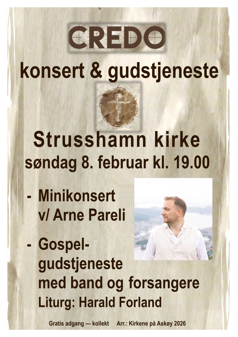 Søndag 8.februar er du igjen velkommen til "CREDO - konsert & gudstjeneste" i Strusshamn kirke! Kl.19.00 starter vi med en kort konsert ved sangeren Arne Pareli. Etter konserten fortsetter vi med en nattverdgudstjeneste til musikken fra CREDO-messen (Oslo Gospel Choir).Liturg er vkarprest Harald Forland. Gratis adgang - kollekt. Velkommen!