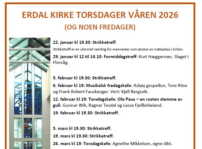Det skjer mye spennende om torsdagene (og noen fredager) i Erdal kirke våren 2026