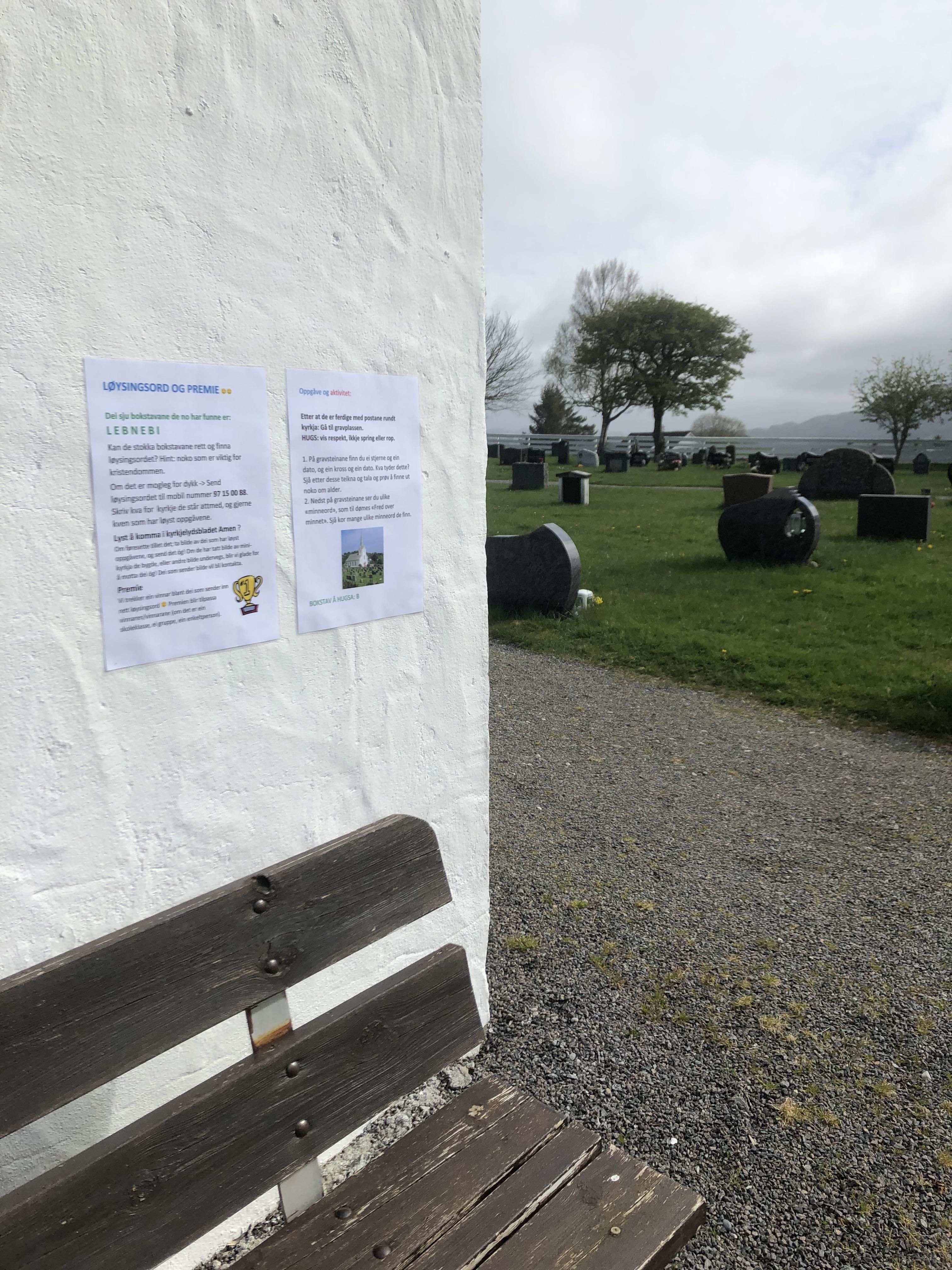Vi som underviser barn i kirken har laget rebusløyper rundt alle kirkene. Rebusløypen har sju poster, og det er det samme hvor man starter, bortsett fra posten om GRAVPLASS – den er det lurt å avslutte med, særlig ved de kirkene der gravplassen ligger et stykke unna. På denne posten er det også et oppslag om LØSNINGSORD og PREMIERING.